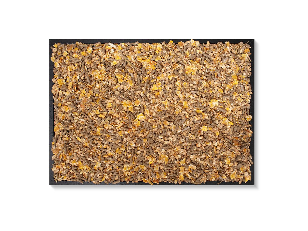 Kukuřičné vločky, ječné vločky, pšeničné otruby, špaldové slupky, vojtěšková moučka, pšenice, melasa z cukrové řepy, uhličitan vápenatý, lněný olej, chlorid sodný, vojtěškové seno, ječmen, oxid hořečnatý, fosforečnan vápenatý, pivovarské mláto, pivovarské kvasnice