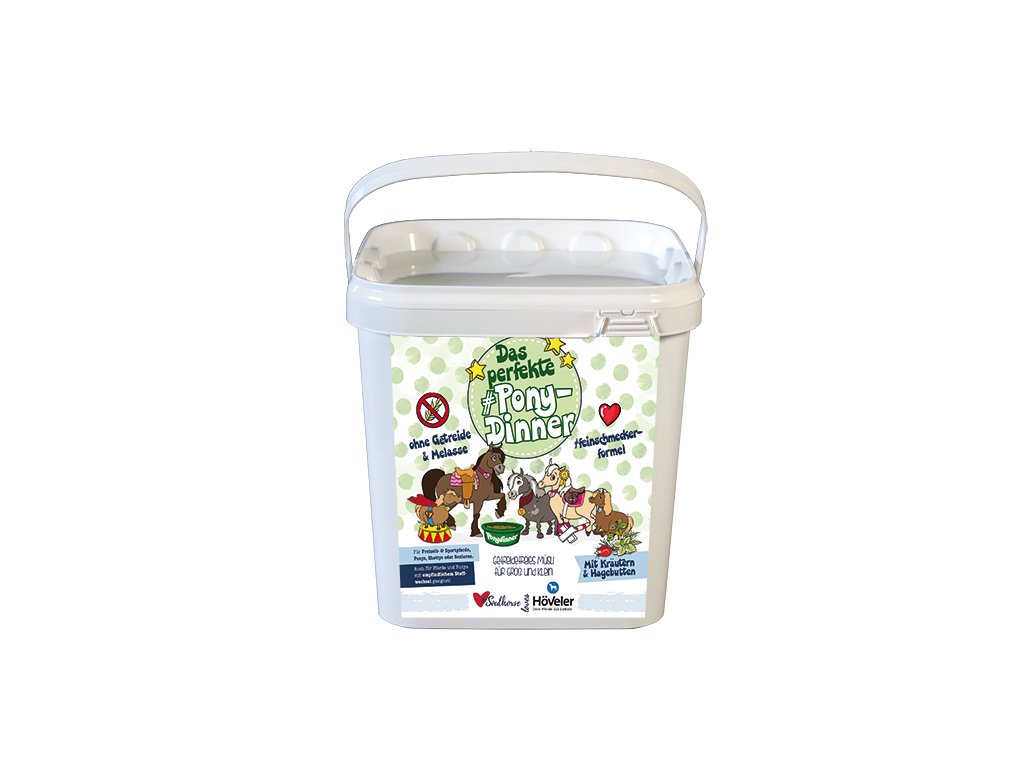 Höveler Pony Dinner je doplňkové krmivo bez melasy a obilovin, vhodné zejména pro koně a poníky, kteří by měli být krmeni šetrně. Na vlákninu bohaté složení podporuje žvýkání, a tím i produkci slin, které chrání žaludeční sliznici. Jakmile se totiž sliny dostanou do žaludku, neutralizují žaludeční kyselinu a vytvoří ochranný film.